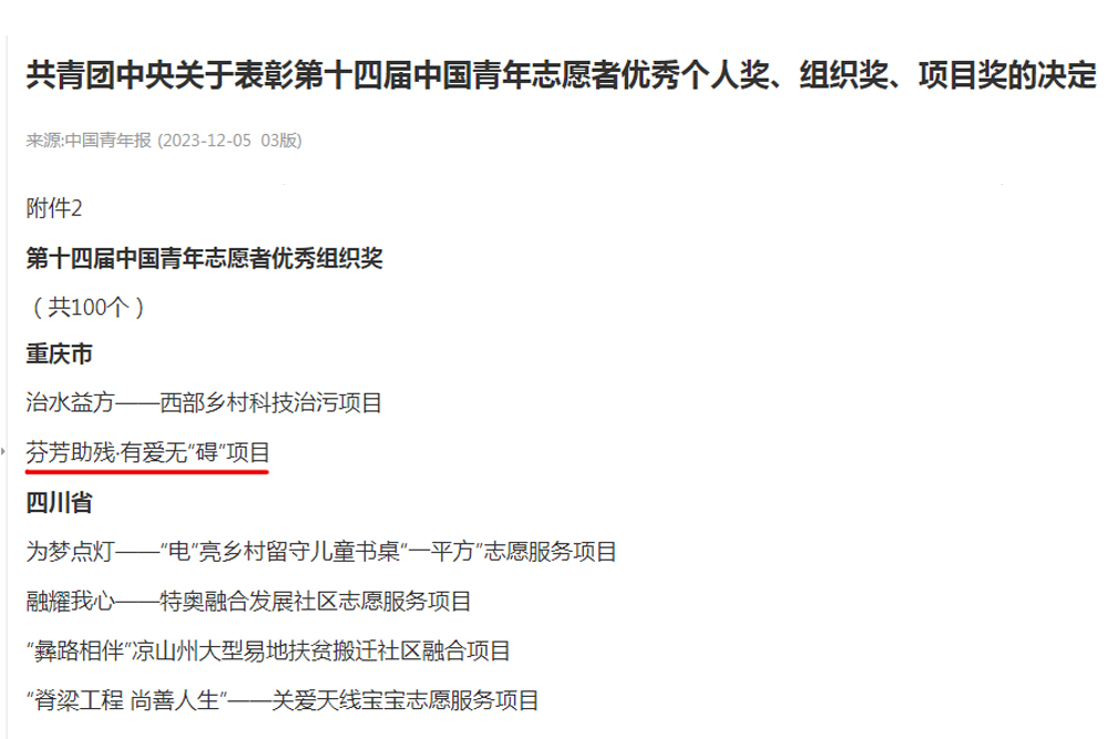 近日,在共青团中央、中国志愿者协会举办的第十四届中国青年志愿者项目奖评选中,beat365官网重点打造的“芬芳助残·有爱无‘碍’”项目荣获第十四届“中国青年志愿者优秀项目奖”。