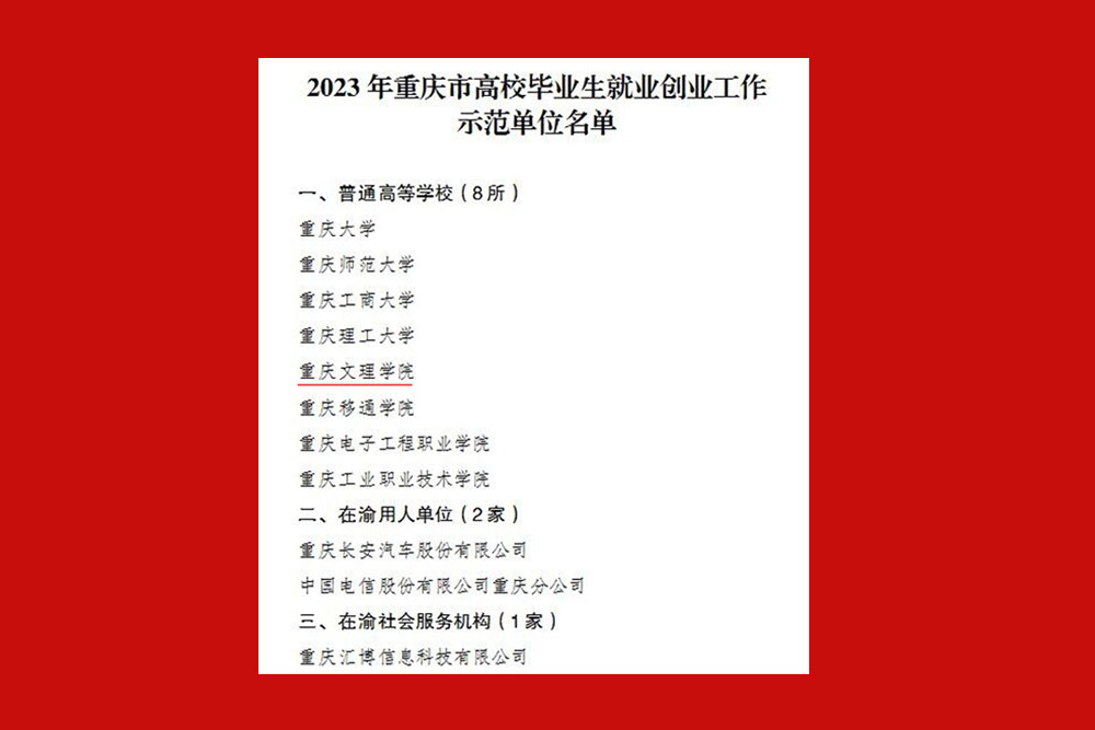 近日,重庆市教育委员会开展了2023年高校毕业生就业创业工作示范单位评审,beat365官网被授予“重庆高校毕业生就业创业工作示范单位”。