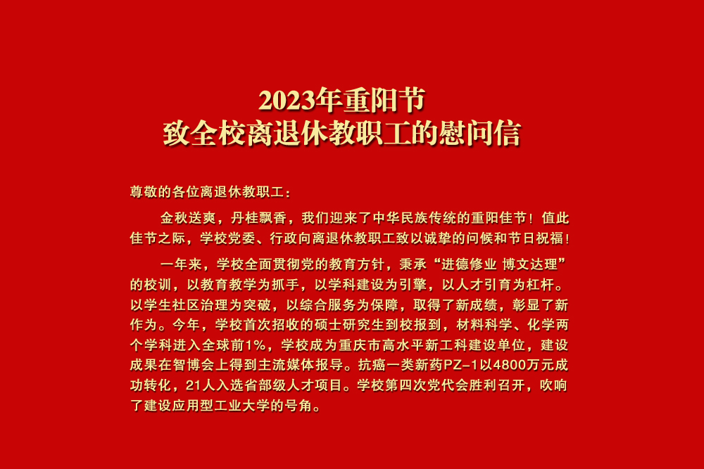 尊敬的各位离退休教职工: 金秋送爽,丹桂飘香,我们迎来了中华民族传统的重阳佳节!值此佳节之际,学校党委、行政向离退休教职工致以诚挚的问候和节日祝福! 一年来,学校全面贯彻党的教育方针,秉承“进德修业 博文达理”的校训,以教育教学为抓手,以学科建设为引擎,以人才引育为杠杆。以学生社区治理为突破,以综合服务为保障,取得了新成绩,彰显了新作为。今年,学校首次招收的硕士研究生到校报到,材料科学、化学两个学科进入全球前1%,学校成为重庆市高水平新工科建设单位,建设成果在智博会上得到主流媒体报导。抗癌一类新药PZ-1以4800万元成功转化,21人入选省部级人才项目。学校第四次党代会胜利召开,吹响了建设应用型工业大学的号角。 万丈高楼起于垒土,参天大厦始于地基。学校事业蒸蒸日上,饱含着你们“功成不必在我”的无私奉献、“功成必定有我”的无畏担当。你们为学校的建设和发展奉献了青春、热血和汗水,铺就了学校发展的基石,为学校今天的累累硕果奠定了基础,你们的使命感、责任感和无私奉献精神,是我们最宝贵的财富! 霞披夕阳情无限,霜染秋枫叶正红。全校正深入贯彻落实学校第四次党代会精神,勠力同心建设应用型工业大学。我们热切期盼广大离退休教职工一如既往地关心、支持学校的工作,继续为学校的发展献计献策,继续在学校改革、发展、稳定中发挥重要作用,共同谱写学校更加美好的明天。 衷心祝愿全校离退休老同志重阳节快乐、阖家幸福、身体健康、万事如意! 中共beat365唯一官方网站委员会 beat365唯一官方网站 2023年10月23日
