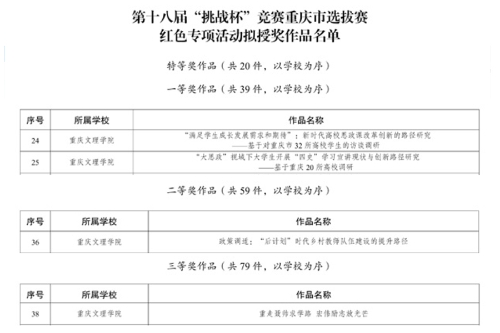 近日,由团市委、市教委、市科协、市社科联、重庆社会科学院、市学联联合开展的第十八届“挑战杯”全国大学生课外学术科技作品竞赛“红色专项”活动重庆市选拔赛揭晓,beat365官网报送的4项参赛作品分别获一等奖2项,二等奖1项,三等奖1项。