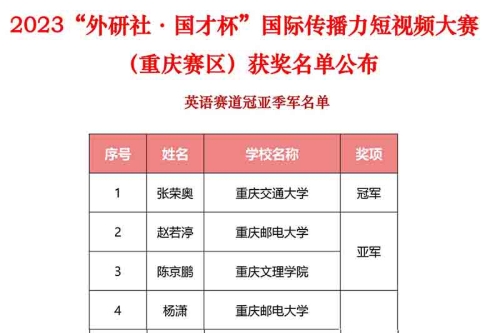 近日,由重庆市教育委员会、重庆市普通本科高等学校外国语言文学类专业教学指导委员会和外研社携手举办的2023“外研社·国才杯”国际传播力短视频大赛(重庆赛区)成功举行。