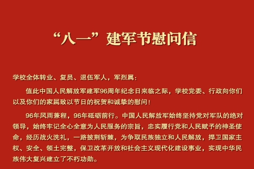 学校全体转业、复员、退伍军人,军烈属: 值此中国人民解放军建军96周年纪念日来临之际,学校党委、行政向你们以及你们的家属致以节日的祝贺和诚挚的慰问! 96年风雨兼程,96年砥砺前行。中国人民解放军始终坚持党对军队的绝对领导,始终牢记全心全意为人民服务的宗旨,忠实履行党和人民赋予的神圣使命,经历战火洗礼,一路披荆斩棘,为争取民族独立和人民解放,捍卫国家主权、安全、领土完整,保卫改革开放和社会主义现代化建设事业,实现中华民族伟大复兴建立了不朽功勋。 不同的岗位,一样的奋斗;不同的“战场”,一样的“冲锋”。在人生的不同阶段、不同岗位上,你们接续奋斗、砥砺前行,书写了不平凡的华章。beat365官网全体转业、复员、退伍军人坚持发扬人民军队的光荣传统和优良作风,深入学习贯彻习近平新时代中国特色社会主义思想,自觉增强“四个意识”,坚定“四个自信” ,做到“两个维护”;紧紧围绕学校中心工作,保持军人本色,立足本职岗位、勇于担当作为 ,在教书育人、管理育人、服务育人和学校建设发展中做出了新的贡献。 奋进新征程,扬帆再出发。当前,全党正在深入开展学习贯彻习近平新时代中国特色社会主义思想主题教育,学校正以习近平新时代中国特色社会主义思想为指导,全面贯彻党的二十大精神。下半年,学校即将召开第四次党代会,这是全校绘就美好未来新蓝图,共谋跨越发展新篇章的一次盛会。希望你们继续恪守一日是兵、终身是兵的铮铮誓言,继续保持退役不褪色、永远跟党走的忠诚品格,继续发扬爱国奋斗、岗位建功的昂扬风貌;以更加坚定的信心、更加高昂的斗志、更加务实的作风,全力以赴做好各项工作,为推动学校建设发展,为实现中华民族伟大复兴的中国梦再立新功。 祝同志们节日快乐、身体健康、工作顺利、阖家幸福! 中共beat365唯一官方网站委员会 beat365唯一官方网站 2023年8月1日