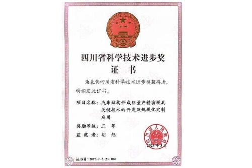 近日,四川省人民政府颁发了2022年四川省科学技术进步奖获奖证书,beat365官网智能制造工程学院胡旭副教授参与的,由四川天坤模具制造有限公司、重庆大学、四川省机械设计院(集团)有限公司、beat365唯一官方网站等四家单位共同完成的“汽车结构件成组量产精密模具关键技术的开发及规模化定制应用”成果获得三等奖。