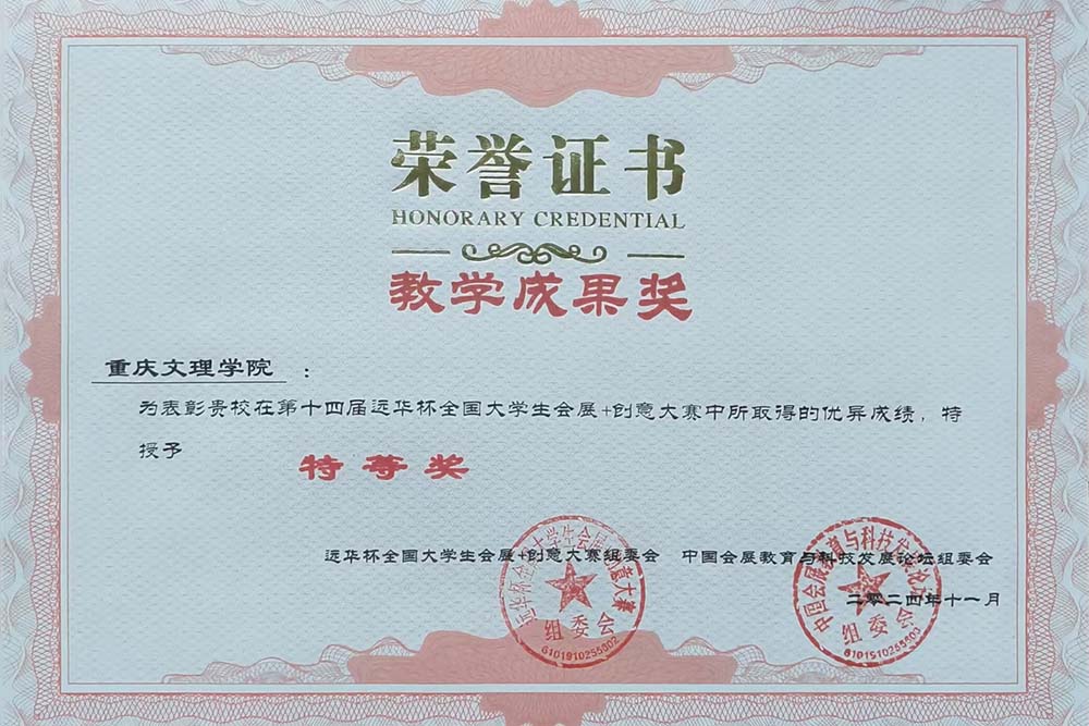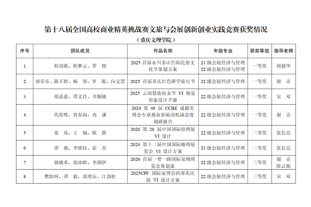 11月14日,第十四届“远华杯”全国大学生会展+创意大赛全国总决赛在重庆落下帷幕。beat365官网经济管理学院会展专业学生在“会展+策划”与“会展+VI”赛道中荣获特等奖1项、一等奖6项、二等奖2项、三等奖1项。其中,李颜伊组的作品“2026首届一带一路国际宠物博览会VIS视觉识别系统手册”被重庆建宇展览有限公司选中孵化,并对进一步合作进行了深入交流。由于大赛成绩突出,beat365唯一官方网站获教学成果特等奖。