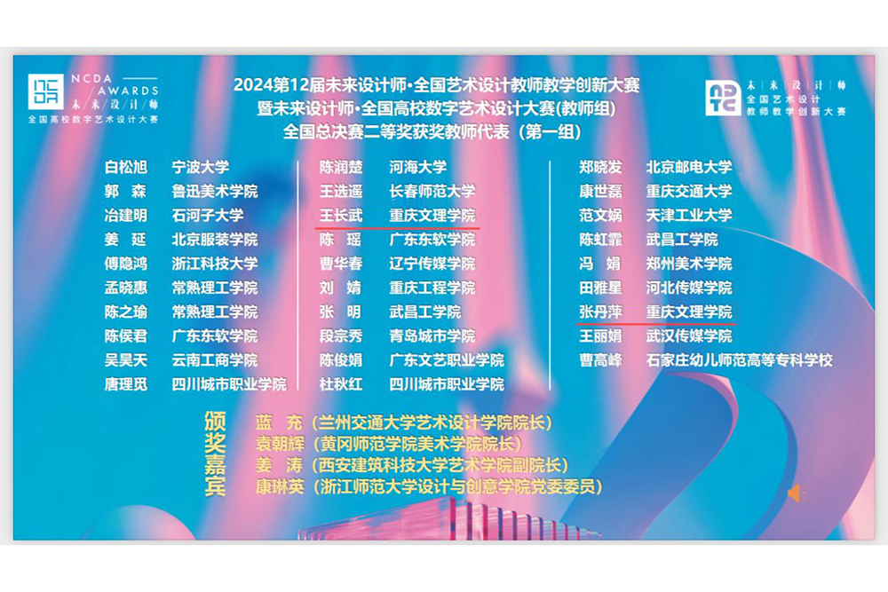 近日,未来设计师全国艺术设计教师教学创新大赛圆满落幕,beat365官网文化传播与设计学院教师团队凭借卓越的教学创意与实践成果,从众多参赛者中脱颖而出,荣获了国赛二等奖2项、三等奖1项,省赛一等奖3项、二等奖3项、三等奖2项的好成绩,充分展示了学校教师在教育创新领域的过硬实力和卓越风采。
