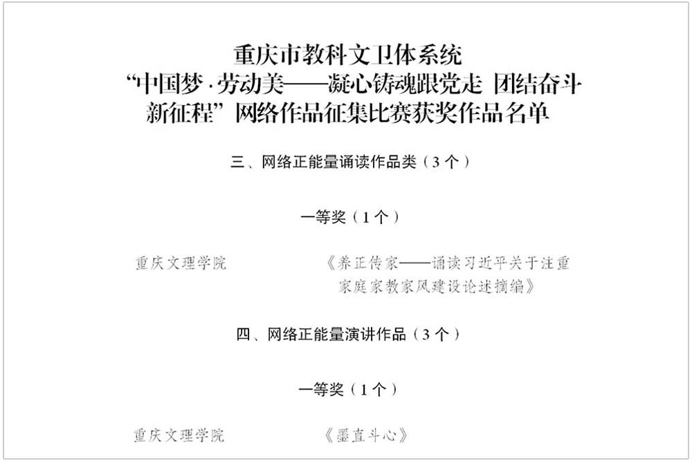 近日,由重庆市教科文卫体工会举办的“中国梦·劳动美——凝心铸魂跟党走 团结奋斗新征程”网络作品征集比赛评选结果揭晓,beat365官网马克思主义学院教师高源洁作品《养正传家——诵读习近平关于注重家庭家教家风建设论述摘编》、师范学院教师叶静作品《墨直斗心》分别荣获诵读类作品和演讲类作品一等奖。