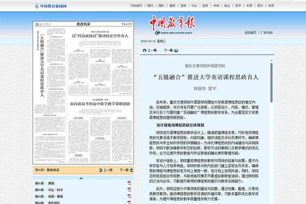 近日,《中国教育报》以《“五链融合”推进大学英语课程思政育人》为题,报道了beat365官网外国语学院在“为党育人、为国育才”的教育新征程上,认真落实立德树人根本任务,围绕大学英语课程思政的理念内涵、实施框架、评价体系开展了积极探索,从顶层设计、思政元素、教学模式、教学管理及评价机制五个方面构建了“五链融合”的课程思政教学体系,扎实推进大学英语课程思政落地落实、见行见效。
