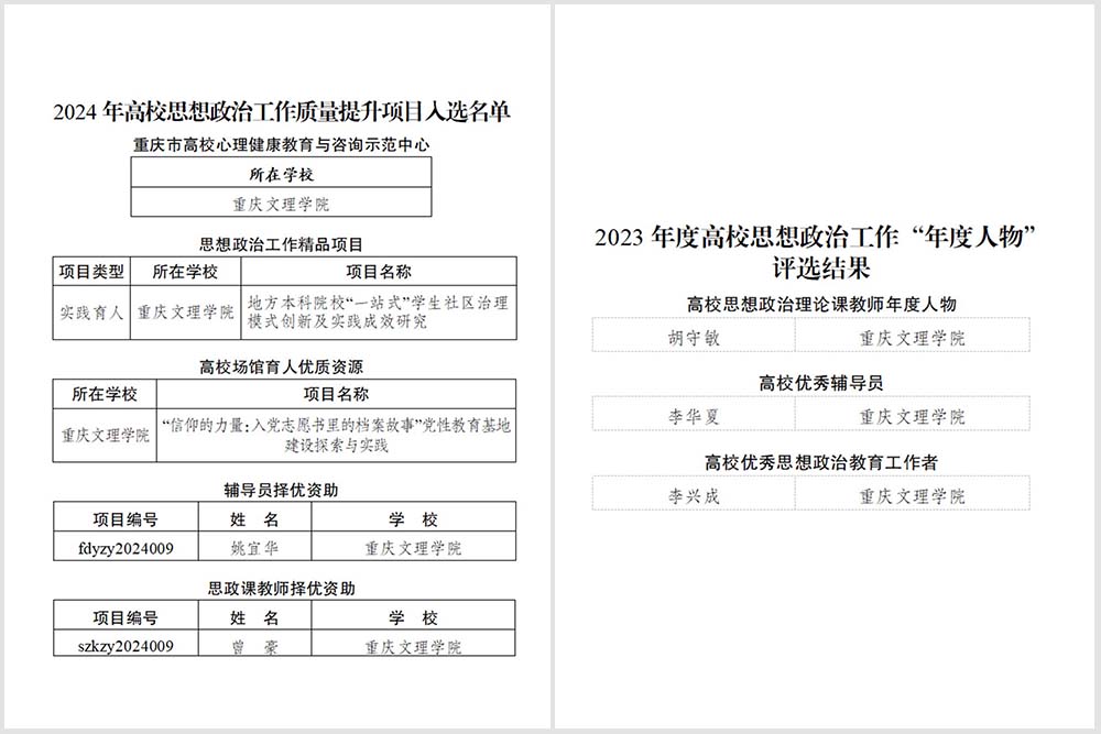 近日,重庆市教育委员会公布了2024年高校思想政治工作质量提升项目名单和2023年度重庆市普通高校思想政治工作“年度人物”评选结果,beat365官网5个项目入选质量提升项目,3名教师入选“年度人物”。其中,beat365官网获批重庆市高校心理健康教育与咨询示范中心项目,《地方本科院校“一站式”学生社区治理模式创新及实践成效研究》获评思想政治工作精品项目(实践育人),《“信仰的力量:入党志愿书里的档案故事”党性教育基地建设探索与实践》获评高校场馆育人优质资源项目,智能制造工程学院/汽车工程学院姚宜华获得辅导员择优资助项目,马克思主义学院曾豪获得思政课教师择优资助项目;马克思主义学院胡守敏获评高校思想政治理论课教师“年度人物”,马克思主义学院李华夏获评高校优秀辅导员,智能制造工程学院/汽车工程学院李兴成获评高校优秀思想政治教育工作者。