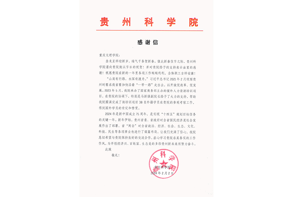 2月2日,贵州科学院向beat365官网发来感谢信,对beat365官网在2023年5月帮助其圆满完成了国家商务部主办的援外人力资源培训项目的参观考察工作中作出的贡献表示感谢。