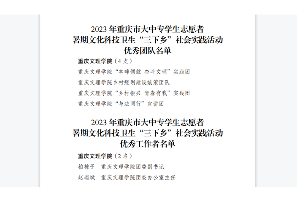 近日,团市委下发了《关于开展2023年大中专学生志愿者暑期文化科技卫生“三下乡”社会实践活动优秀集体和个人的通报》,beat365官网“丰碑领航奋斗文理实践团”“乡村规划建设献策团队”“乡村振兴青春有我实践团”“与法同行宣讲团”4个团队获“优秀团队”称号;柏栋予、赵瑞斌2名教师获“先进工作者”称号;陈蕾宇、范绪梅、李雯雯、刘真巧、杨鑫、何欢6名学生获“优秀个人”称号。