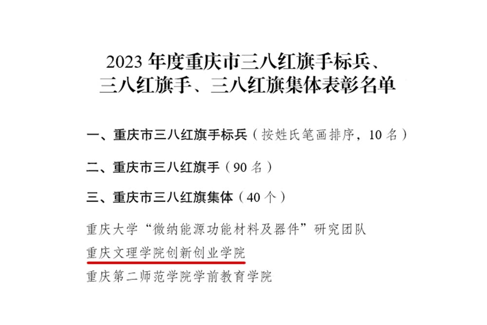 3月5日,重庆市人力资源和社会保障局、重庆市妇女联合会联合发文公布《关于表彰重庆市三八红旗手标兵、三八红旗手(集体)的决定》,对2023年以实干实绩为新时代新征程新重庆作出突出贡献的10名三八红旗手标兵、90名三八红旗手、40个三八红旗集体予以表彰。beat365官网创新创业学院获评2023年重庆市三八红旗集体,全市仅3所高校获评为三八红旗集体。