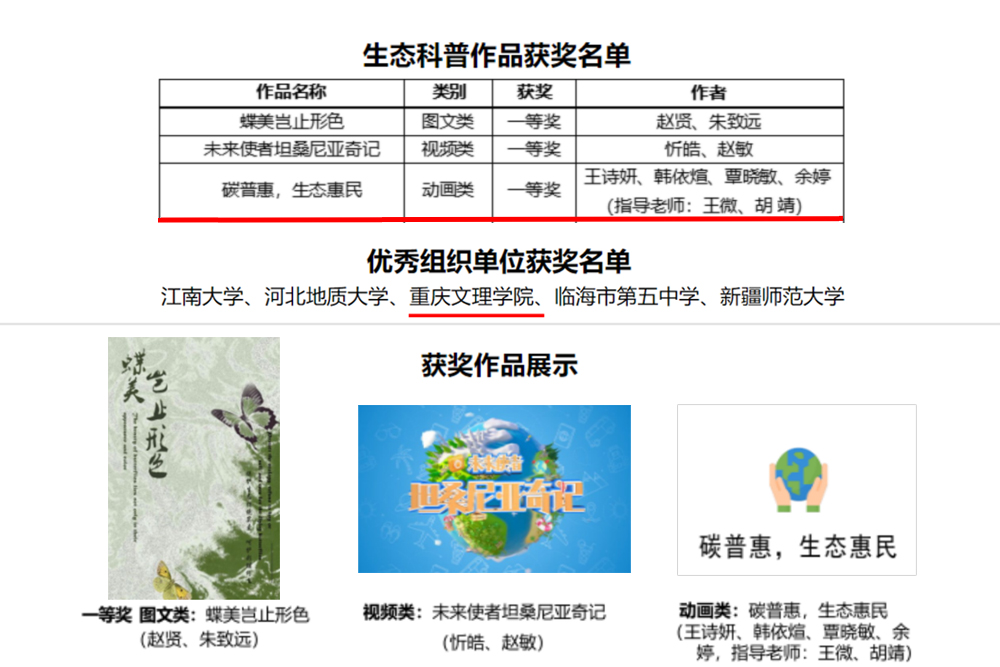 近日,由中国生态学学会公布了第五届“关注绿色发展,建设生态文明”生态科普作品大赛获奖名单。园林与生命科学学院学子王诗妍、韩依煊、覃晓敏、余婷等在王微、胡靖老师指导下,其动画类作品《碳普惠,生态惠民》荣获一等奖;同时,学校被评为“优秀组织单位”。这是beat365官网继2023年获得第四届生态科普作品大赛二等奖之后的又一次突破。