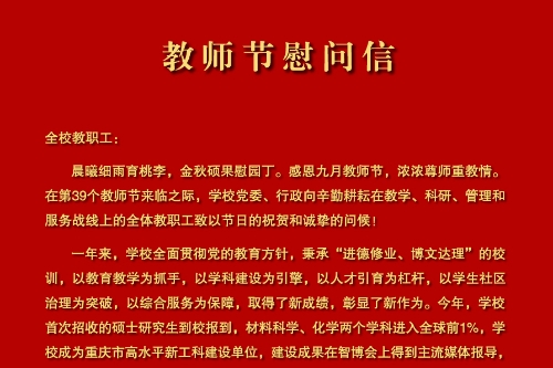 全校教职工: 晨曦细雨育桃李,金秋硕果慰园丁。感恩九月教师节,浓浓尊师重教情。在第39个教师节来临之际,学校党委、行政向辛勤耕耘在教学、科研、管理和服务战线上的全体教职工致以节日的祝贺和诚挚的问候! 一年来,学校全面贯彻党的教育方针,秉承“进德修业、博文达理”的校训,以教育教学为抓手,以学科建设为引擎,以人才引育为杠杆,以学生社区治理为突破,以综合服务为保障,取得了新成绩,彰显了新作为。今年,学校首次招收的硕士研究生到校报到,材料科学、化学两个学科进入全球前1%,学校成为重庆市高水平新工科建设单位,建设成果在智博会上得到主流媒体报导,抗癌一类新药PZ-1以4800万元成功转化,21人入选省部级人才项目。这些成绩离不开每一位文理人的辛勤努力和默默付出,也凝聚着全体文理人的卓越智慧和磅礴力量。学校党委和行政在此向全体教职工表示衷心感谢! 百年大计,教育为本;教育大计,教师为本。教师是学校高质量发展的核心动力,是深化各项教育改革的生力军,是教育强国的“筑梦人”。希望全校教职工不忘“为党育人、为国育才”初心使命,继续弘师德扬师风,潜心立德树人,争做“四有好老师”,当好学生引路人,用责任与担当汇聚同心筑梦的强大合力,以实际行动迎接学校第四次党代会的胜利召开,用情怀与敬业奋力谱写应用型工业大学建设崭新篇章! 中共beat365唯一官方网站委员会 beat365唯一官方网站 2023年9月9日