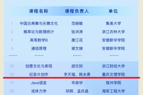 近日,教育部在线教育研究中心公布了2022年“拓金计划”示范课程入选名单,beat365官网李天福教授和韩永青教授为负责人的国家级一流本科课程《纪录片创作》成功入选,成为重庆市高校第2门入选该计划的课程。