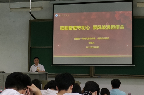 6月1日下午,由教务处和经济管理学院联合举办的劳模工匠精神进校园宣讲活动在知津楼一阶顺利举行。重庆新泰机械有限责任公司常务副总经理、全国五一劳动奖章获得者、全国劳动模范李朝兵应邀来校作报告。教务处、经济管理学院相关负责人及经济管理学院300余名学生代表参加了报告会。