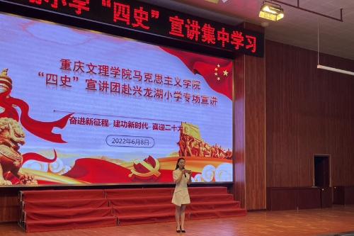 6月8日上午,学校马克思主义学院“四史”学习教育宣讲团10名成员赴永川区兴龙湖小学开展以“奋进新征程、建功新时代、喜迎二十大”为主题的专场宣讲。兴龙湖小学领导及全体六年级的老师和学生共计800余人参与观看。