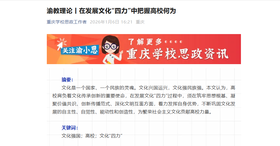 文化是一个国家、一个民族的灵魂。文化兴国运兴,文化强民族强。本文认为,高校肩负着文化传承创新的重要使命,在发展文化“四力”过程中,须在筑牢思想根基、凝聚价值共识