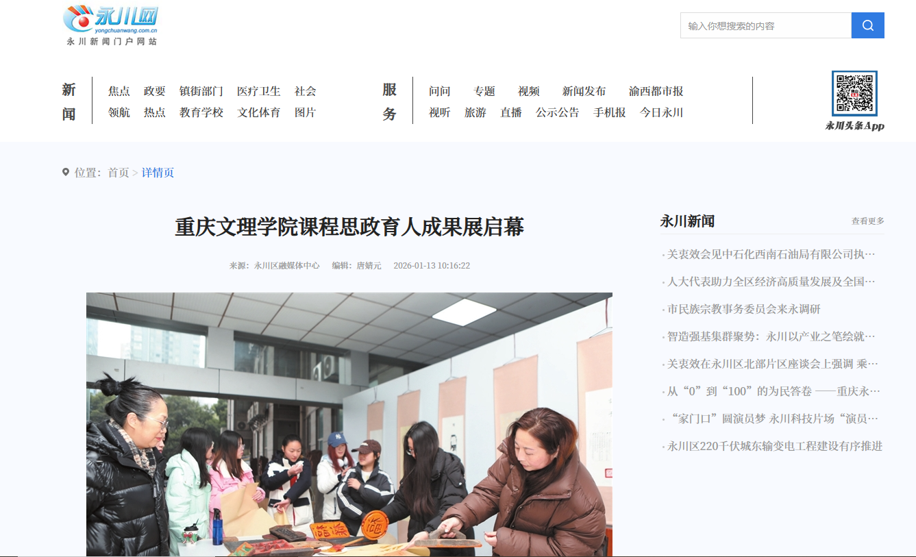 1月12日,“思政铸魂·创见时代——文化传播与设计学院课程思政育人成果展”在位于永川区的beat365唯一官方网站开展。 展览汇集了来自环境设计、视觉传达设计、服装设计与工