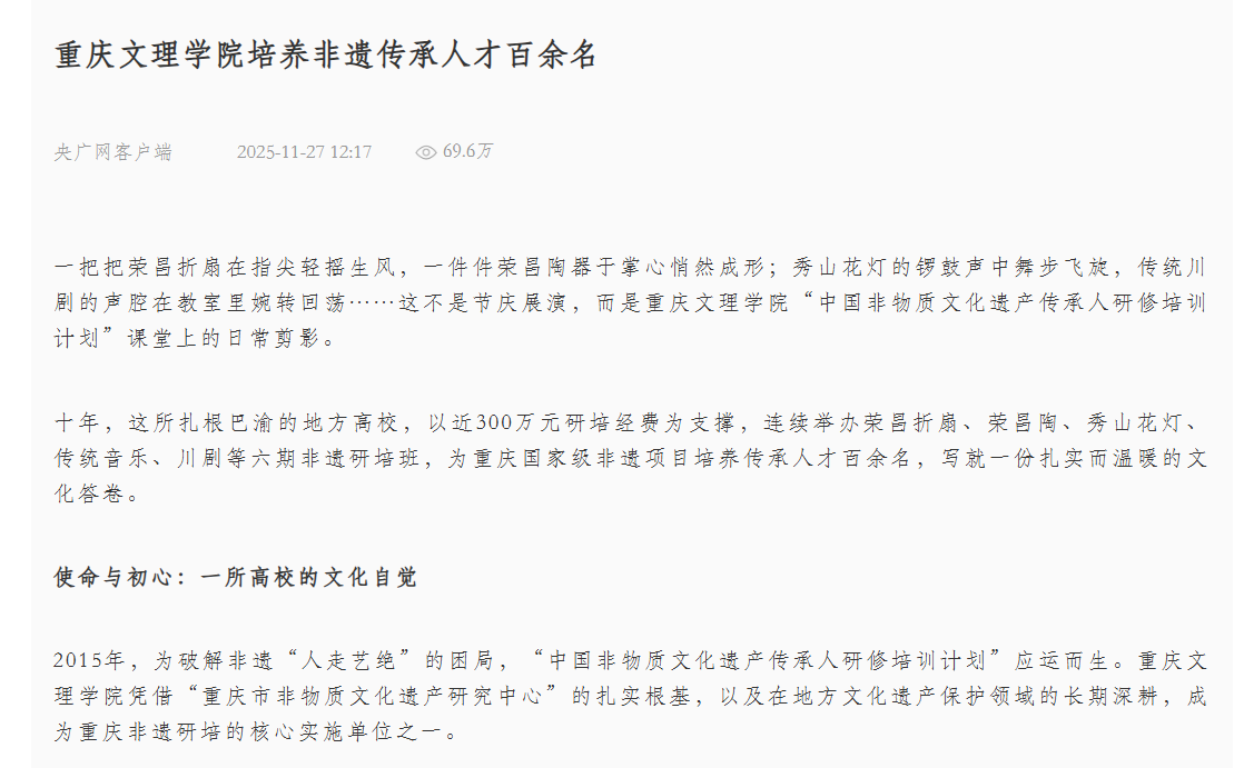 一把把荣昌折扇在指尖轻摇生风,一件件荣昌陶器于掌心悄然成形;秀山花灯的锣鼓声中舞步飞旋,传统川剧的声腔在教室里婉转回荡……这不是节庆展演,而是beat365唯一官方网站“中国