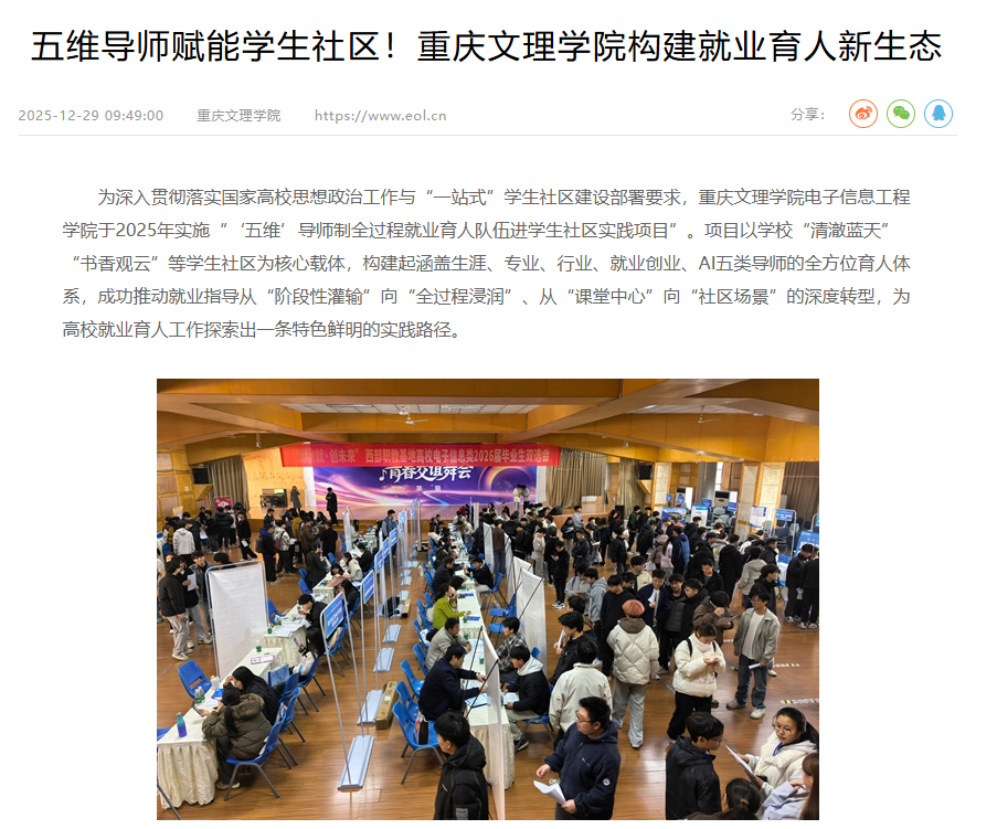 为深入贯彻落实国家高校思想政治工作与“一站式”学生社区建设部署要求,beat365唯一官方网站电子信息工程学院于2025年实施“‘五维’导师制全过程就业育人队伍进学生社区实践