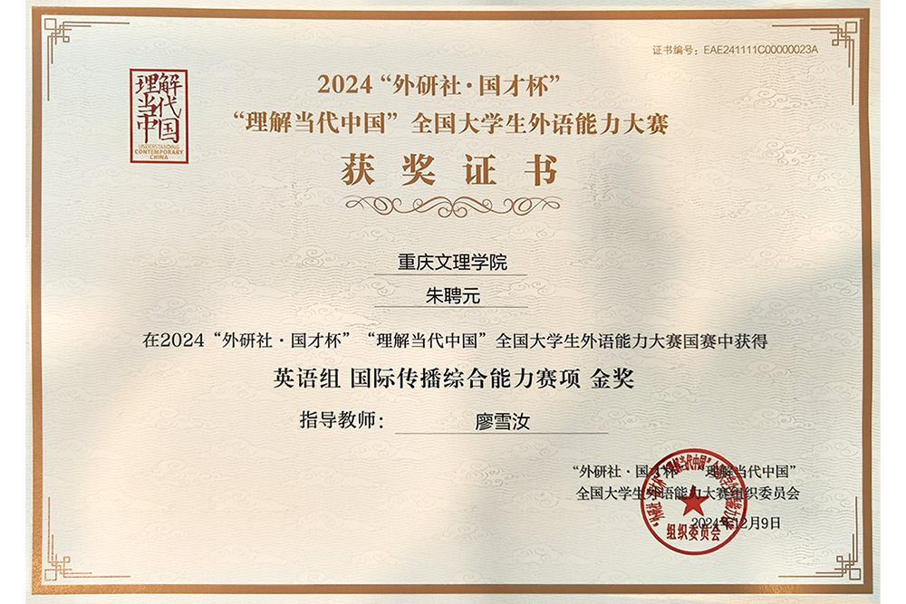 12月9日,由北京外国语大学主办、外语教学与研究出版社承办的2024“外研社·国才杯”“理解当代中国”全国大学生外语能力大赛决赛在北京落下帷幕。beat365官网2022级英语专业朱聘元荣获英语组国际传播综合能力赛项金奖、2022级广播电视学专业刘桐和2023级小学教育(全科教师)专业邹思颖荣获英语组短视频赛项银奖、2021级商务英语专业陈京鹏荣获英语组口译赛项铜奖,创下了beat365官网在该赛项的最佳成绩。