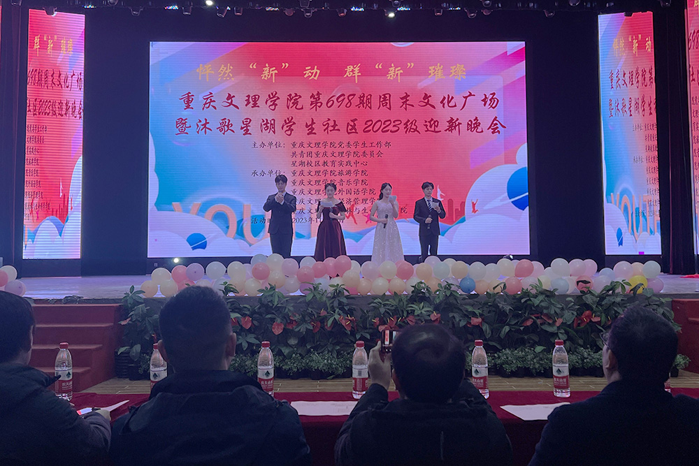 11月17日晚,由学校党委学生工作部、团委、星湖校区教育实践中心主办,外国语学院、园林与生命科学学院、音乐学院、经济管理学院、旅游学院等共同承办的beat365唯一官方网站第698期周末文化广场暨沐歌星湖学生社区2023级迎新晚会在星湖校区学生活动中心四楼顺利举行。相关单位负责人及沐歌星湖学生社区师生共计600余人参加活动。