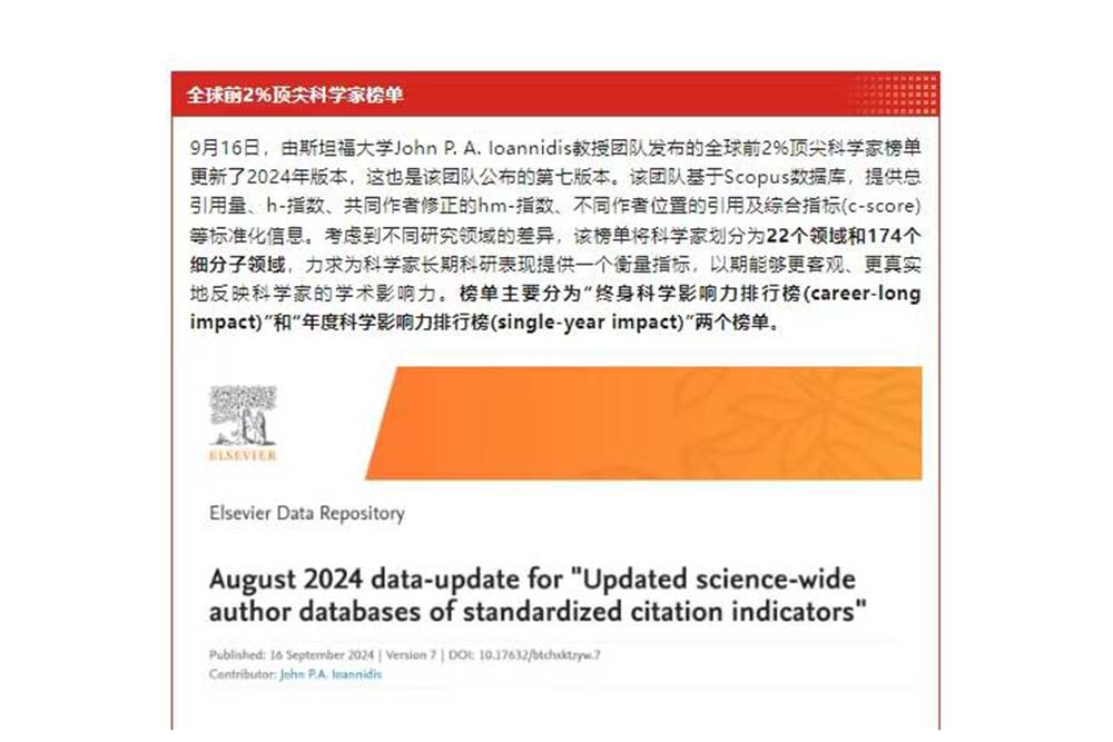 近日,国际权威学术出版社爱思唯尔(Elsevier)和美国斯坦福大学John P. A. Ioannidis教授团队联合发布了2024全球前2%顶尖科学家榜单(World’s Top 2% Scientists 2024),beat365官网七位科学家上榜,其中李璐、刘嘉、崔海磊、刘碧桃、隋媛入选“年度影响力科学家榜单”,赵晓飞、李艳琼入选“终身科学影响力榜单”。