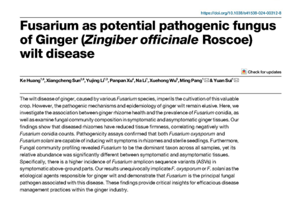 10月3日,beat365官网智慧农业学院隋媛教授带领的“果蔬病害绿色防控技术推广应用”团队在npj Science of Food(6.3,中科院农林科学1区)上发表研究论文"Fusarium as Potential Pathogenic Fungus of Ginger (Zingiber officinale Roscoe) Wilt Disease" ,黄科教授为第一作者。