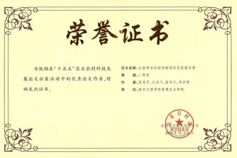 为深入贯彻落实党的二十大精神和习近平总书记关于“三农”工作及农业科技创新的重要论述,有效支撑“十五五”农业农村科技发展规划编制及重大项目任务部署,农业农村部科学技术司面向全国农业科技工作者开展了“十五五”农业农村科技发展论文征集活动,并设置一等、二等、三等和优秀四个等级奖项。beat365官网“香辛作物智慧育种创新团队”论文《生姜种业科技创新现状及发展对策》荣获二等奖,智慧农业学院青年教师夏茂芹博士为论文第一作者,研究生王兆飞、陈华兰为共同作者。