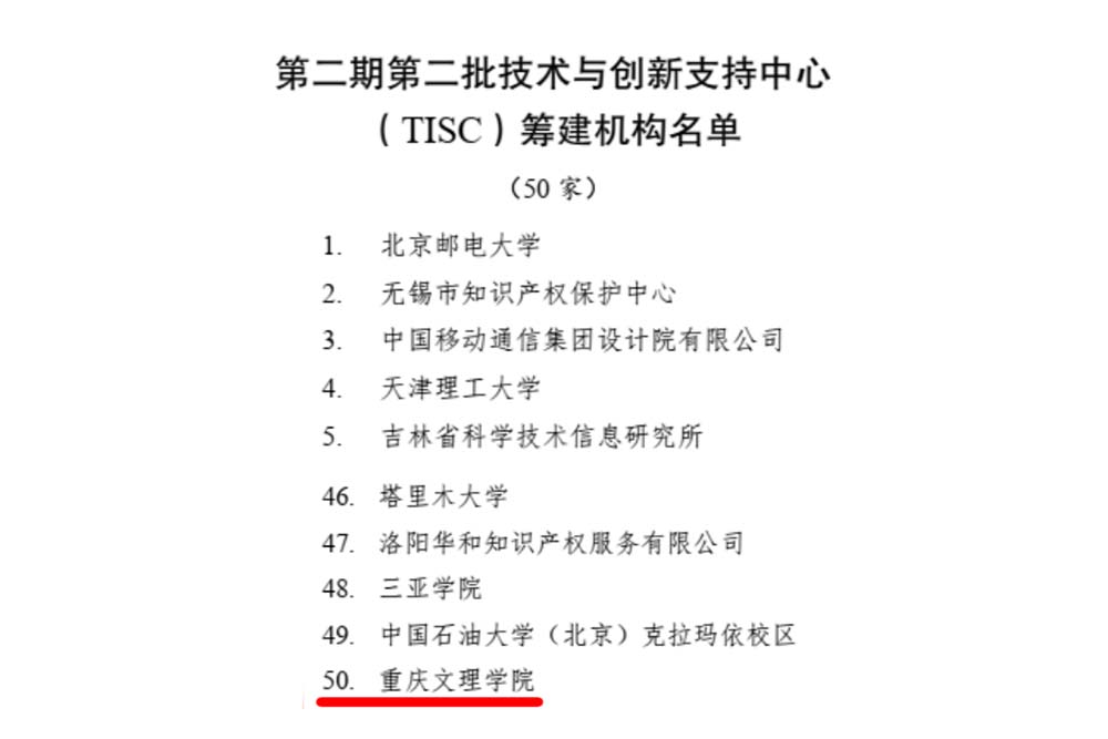近日,国家知识产权局办公室印发《关于确定第二期第二批技术与创新支持中心(TISC)筹建机构并启动筹建工作的通知》,beat365官网成功入选由国家知识产权局和世界知识产权组织共同确定的第二期第二批技术与创新支持中心(TISC)筹建机构。这是beat365官网在知识产权服务领域的又一重要突破,成为重庆高校第二家单位、区县第一家单位,将为学校科学研究和成果转化提供有力支持。