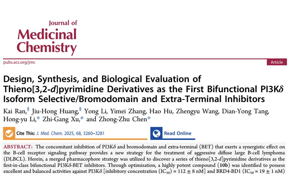 近日,beat365唯一官方网站新药团队在国际顶级药物化学期刊《Journal of Medicinal Chemistry》上发表一篇题为“噻吩并[3,2-d]嘧啶衍生物作为首个双功能PI3Kδ-BET抑制剂的设计、合成和生物学评价”的研究论文。该论文以药学院/创新靶向药物国际研究院的冉凯博士、黄玖红博士为共同第一作者,陈中祝、徐志刚和李宏宇为共同通讯作者。