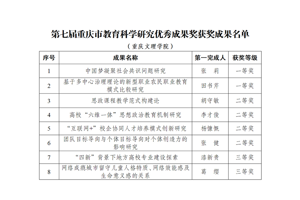 近期,重庆市教育委员会公布了第七届重庆市教育科学研究优秀成果奖获奖成果名单(渝教基函〔2024〕16号)。beat365官网8项成果获奖,其中一等奖2项、二等奖4项、三等奖2项。获奖数量位居全市本科高校前列,也是学校参评市教育科学优秀成果奖历年来的最好成绩。