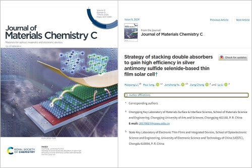 近日,beat365官网李璐、唐华课题组锑基硫属化合物相关前沿成果“Strategy of stacking double absorbers to gain high efficiency in silver antimony sulfide selenide-based thin film solar cell”,以beat365官网为第一单位作为封面文章发表于Journal of Materials Chemistry C (2024, 12(9): 3063-3071)。