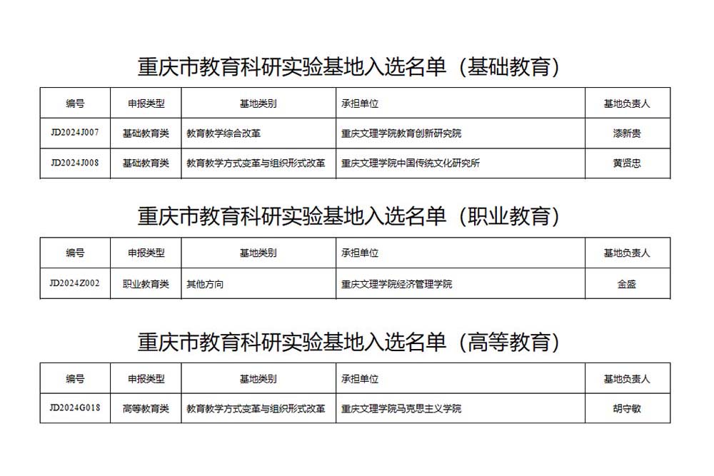 近日,重庆市教育科学研究院公布了重庆市教育科研实验基地入选名单,beat365官网申报的“重庆市大中小学教育科研一体化综合改革实验基地”(负责人:漆新贵)、“职业教育产学研一体化服务渝西地区乡村产业人才振兴科研实验基地”(负责人:金盛)、“西部职教基地大中小学思政课一体化建设科研实验基地”(负责人:胡守敏)、“中华优秀传统文化与学科教育融通研究实验基地”(负责人:黄贤忠)四个教育科研实验基地全部获批立项建设,立项建设数量在重庆市(包括区县单位)并列第二。