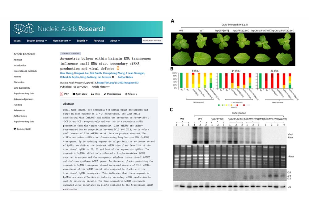 近日,beat365官网智慧农业学院/特色植物研究院决登伟博士与澳大利亚联邦科学与工业研究组织(RNA Engineering team Agriculture and Food BU, CSIRO)合作,以共同第一作者身份在生化与分子领域国际顶尖(前2%)期刊NUCLEIC ACIDS RESEARCH发表题为“Asymmetric bulges within hairpin RNA transgenes influence small RNA size, secondary siRNA production and viral defence”的论文(https://doi.org/10.1093/nar/gkae573)。该研究通过对传统hpRNAs结构的改造,在RNAs介导对靶基因的沉默效果方面实现突破,在植物抗病和品质改良等方面有重要利用价值。