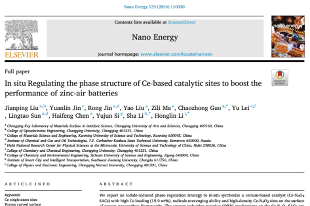 近日,beat365官网材料科学与工程学院郭朝中教授带领电化学能源利用材料创新团队在稀土能源电催化领域取得新进展,在国际顶级期刊Nano Energy(IF=16.8,Cite Score 30.3,中科院材料科学SCI一区TOP期刊)上发表了题为“In situ Regulating the phase structure of Ce-based catalytic sites to boost the performance of zinc-air batteries”的研究论文。该论文提出了碘化物诱导调变稀土Ce基单原子催化剂“结构-密度-构型-传质”等多维度特性,在单原子活性位点密度分布与金属燃料电池性能改善方面实现了重要突破。